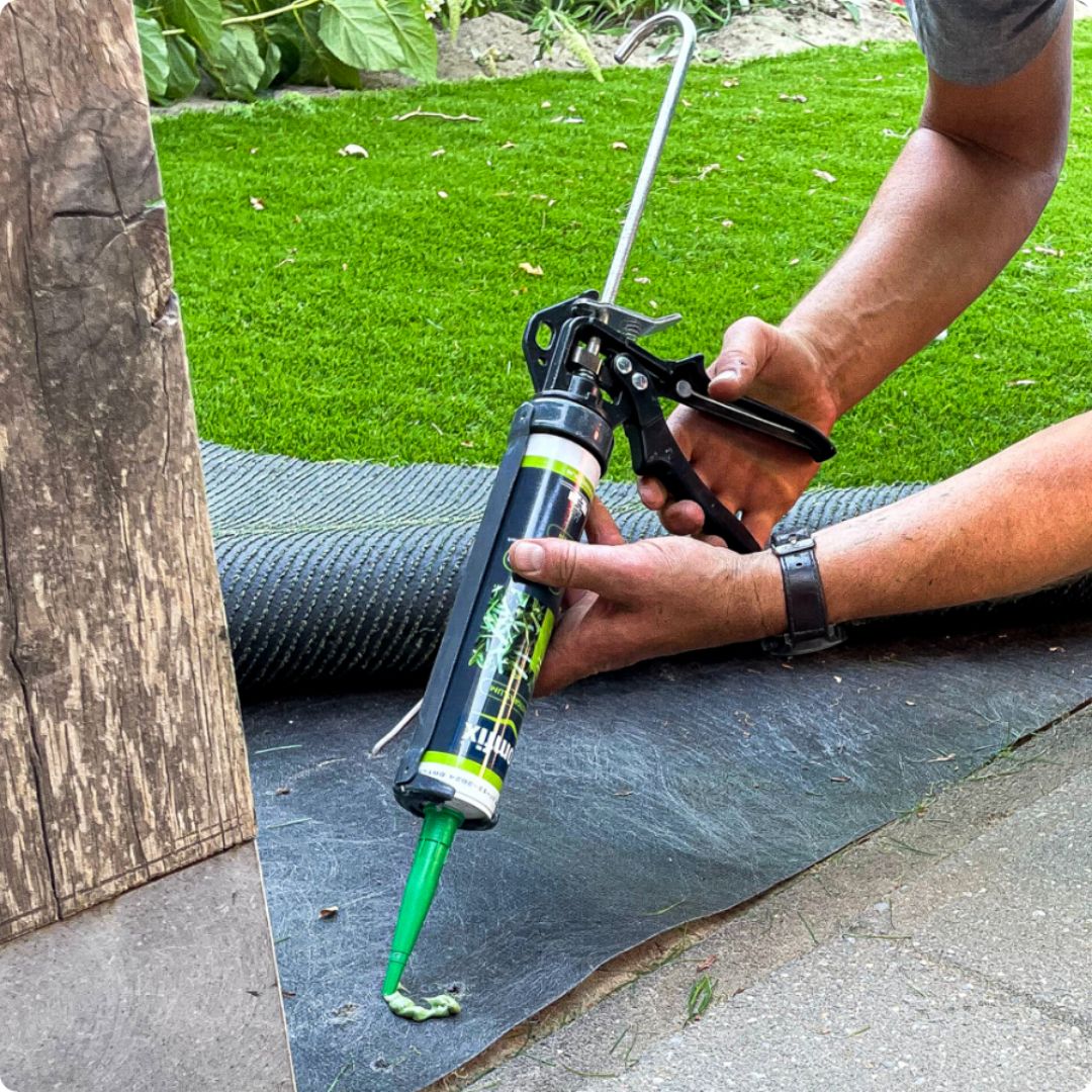 Um Ihrem Kunstrasen zusätzlichen Halt zu verleihen, sollten Sie ihn bei der Montage mit Kunstrasenkleber verbinden. Kunstrasenkleber eignet sich perfekt für harte Oberflächen wie etwa Fliesen oder Beton. Um den Kunstrasen zu verkleben müssen Sie lediglich etwas Kleber entlang der Kanten der schwarzen Rückseite der Kunstrasenmatte verteilen. Hierbei sollten Sie beachten, die Ecken ebenfalls gut zu verleimen, sodass sie sich nicht vom Untergrund ablösen. Zusätzlich sollten Sie auch die Mitte mit Kleber versehen, um maximalen Halt zu garantieren. Besonders in Gärten oder auf Terrassen kann Wind hier Schäden verursachen.